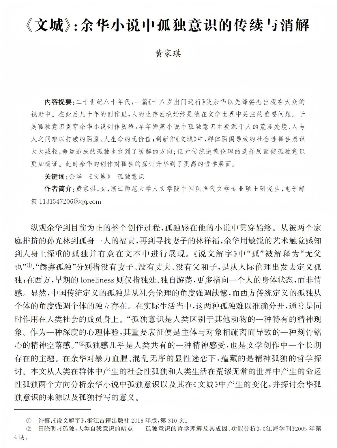 作者简介:黄家琪,女,浙江师范大学人文学院中国现当代文学专业硕士研究生,电子邮箱1131547206@qq.com