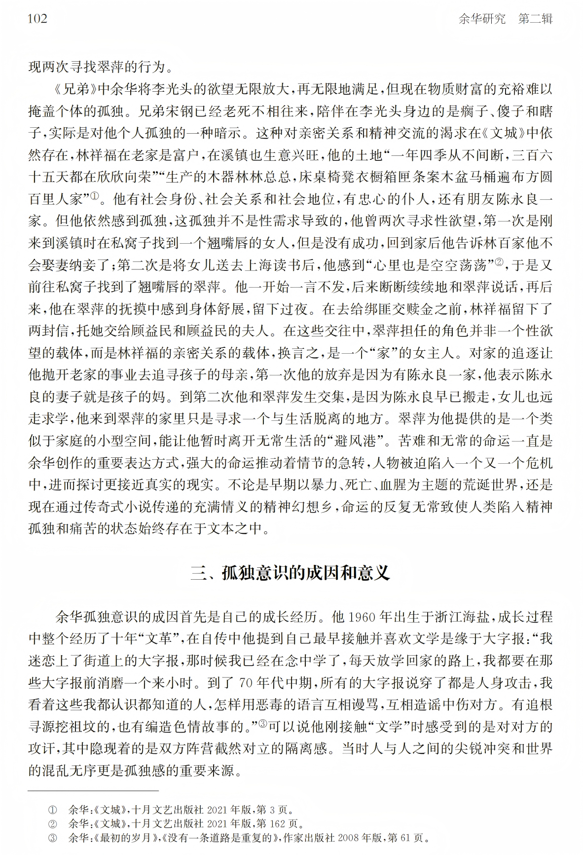 内容提要:二十世纪八十年代,一篇《十八岁出门远行》使余华以先锋姿态出现在大众的视野中。在此后几十年的创作里,人的生存困境始终是他在文学世界中关注的重要问题。于是孤独意识贯穿余华小说创作历程,早年短篇小说中孤独意识主要源于人的荒诞处境、人与人之间难以打破的隔膜、人生命的无价值;到新作《文城》中,群体隔阂导致的社会性孤独意识大大减轻,命运造成的孤独也找到了缓解的方向;但对传统道德伦理的选择反而使孤独意识更加确证。此时余华的创作对孤独的探讨升华到了更高的哲学层面。