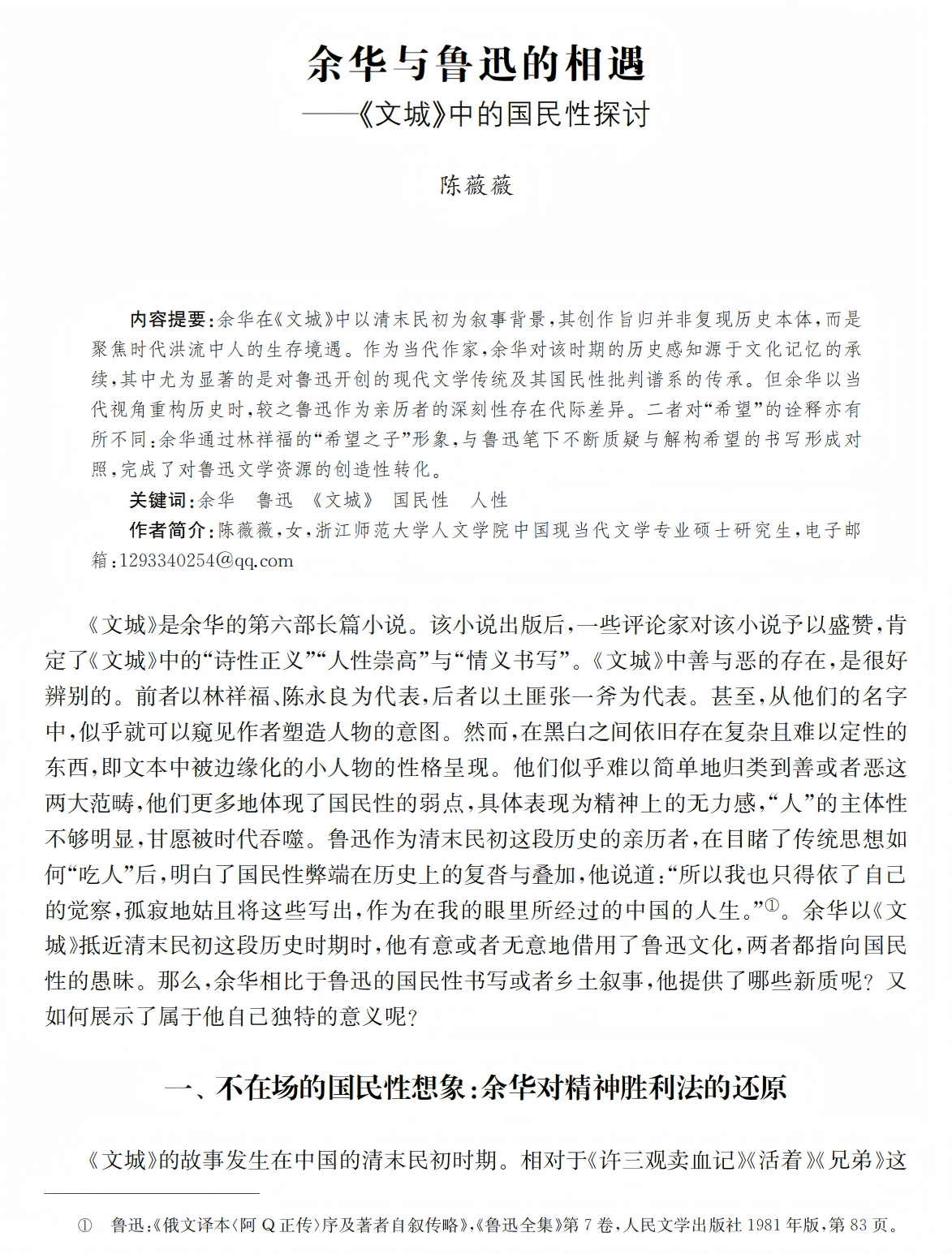 作者简介:陈薇薇,女,浙江师范大学人文学院中国现当代文学专业硕士研究生,电子邮箱:1293340254@qq.com