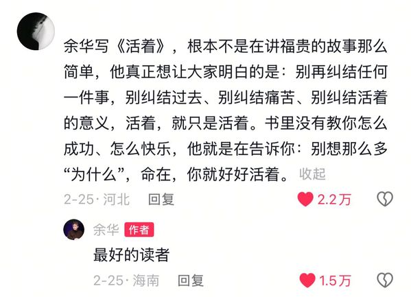 前段时间一位网友在余华的抖音评论区留言,被余华回复“最好的读者”。TA的评论恰与“生命的要求”之义不谋而合: