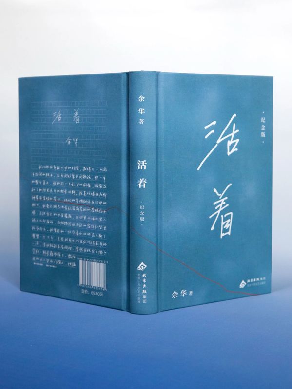 此次《活着》纪念版的封面由艺术家张晓刚设计,书名烫白的“活着”二字取自余华最初创作这本书的手稿,朴素有力,凸显了这一版本的纪念意义。铺满封面的雾蓝色浓淡不一,氤氲蒙眬,营造出一种深不见底的空间感;一条红线飘荡着蜿蜒其间,似乎从历史或记忆深处延伸而来,如同命运的轨迹。
