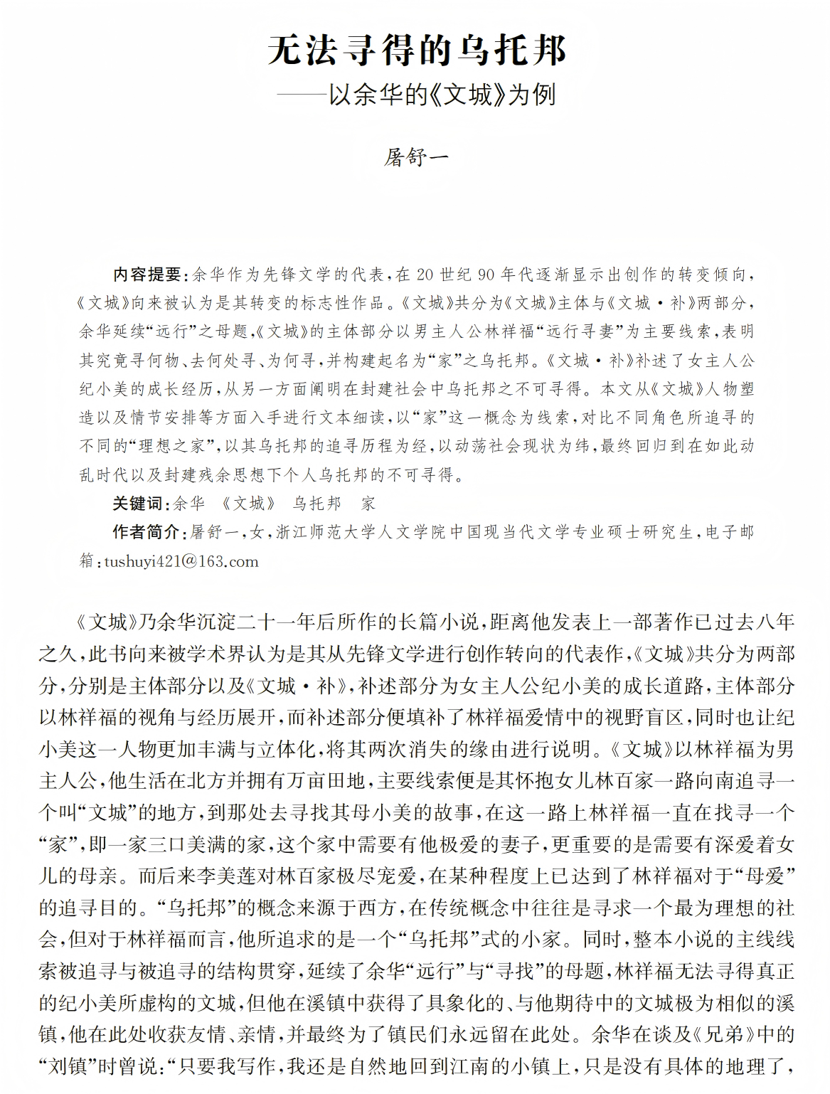 作者简介:屠舒一,女,浙江师范大学人文学院中国现当代文学专业硕士研究生,电子邮箱:tushuyi421@163.com