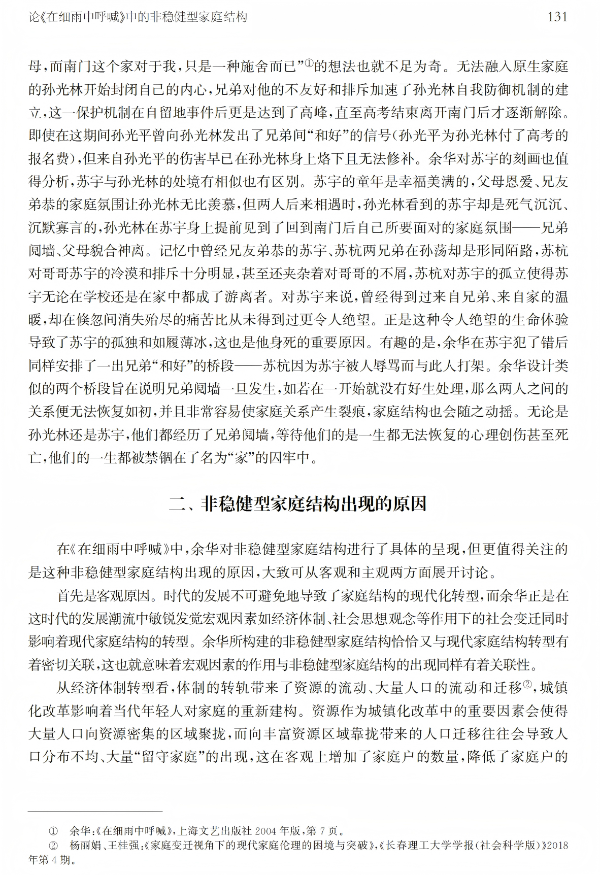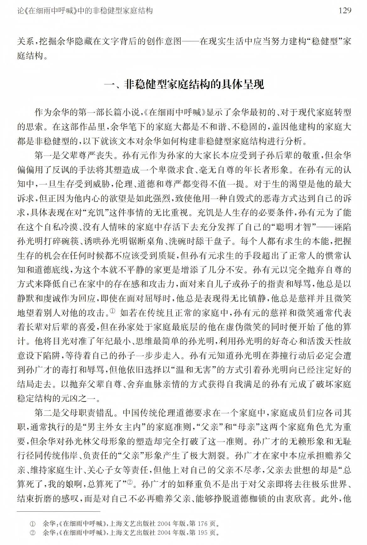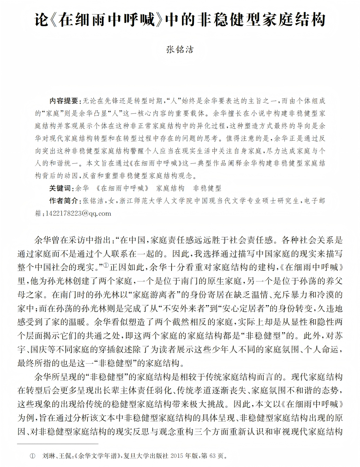 关键词:余华 《在细雨中呼喊》 家庭结构 非稳健型